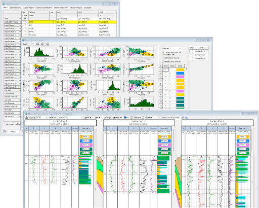 Create electrical facies logs and rock typing with standard statistical routines, clustering data into groups to produce an electrical facies log, enabling geological facies correlation.